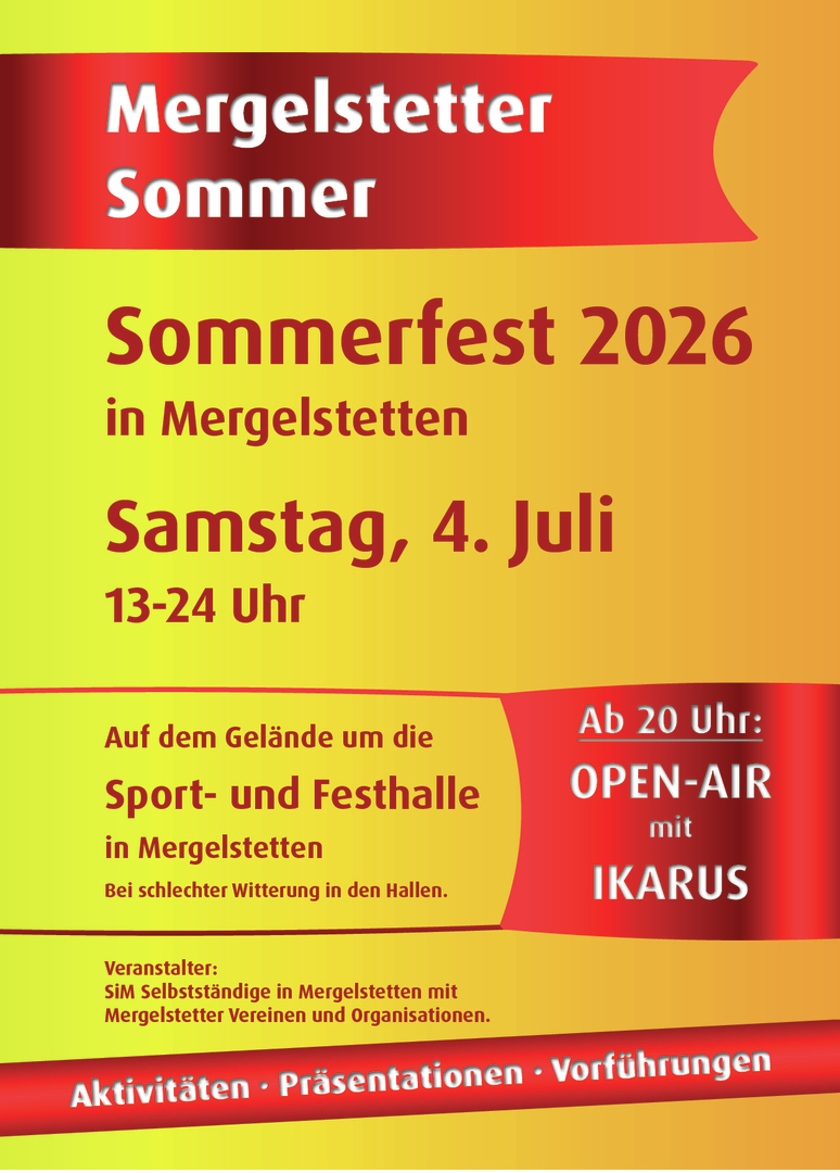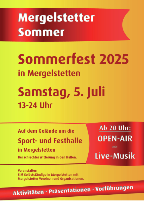 Der Gewerbeverein SiM –Selbständige in Mergelstetten- veranstaltet gemeinsam mit dem Förderverein der Kinderwelt und der Silcherschule Mergelstetten unter Beteiligung mehrerer Mergelstetter Vereine und Institutionen am 04. Juli 2015 das 2. Mergelstetter Sommerfest.